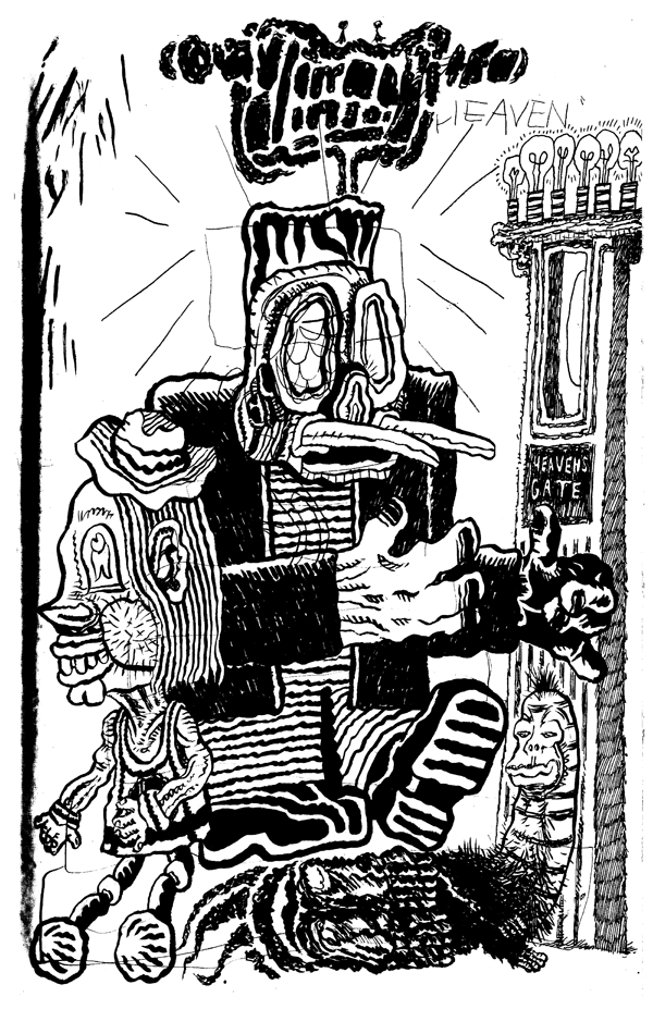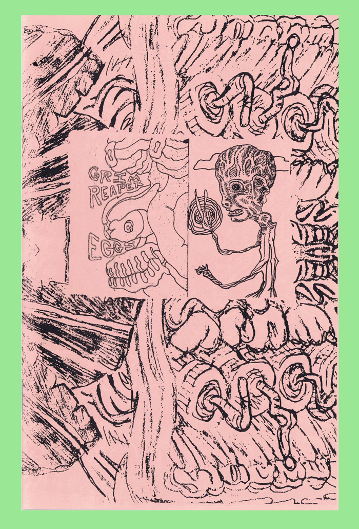 16 page sketchbook drawing zine. 8.5X5.5, on orange and pink paper. Neebus raves.
