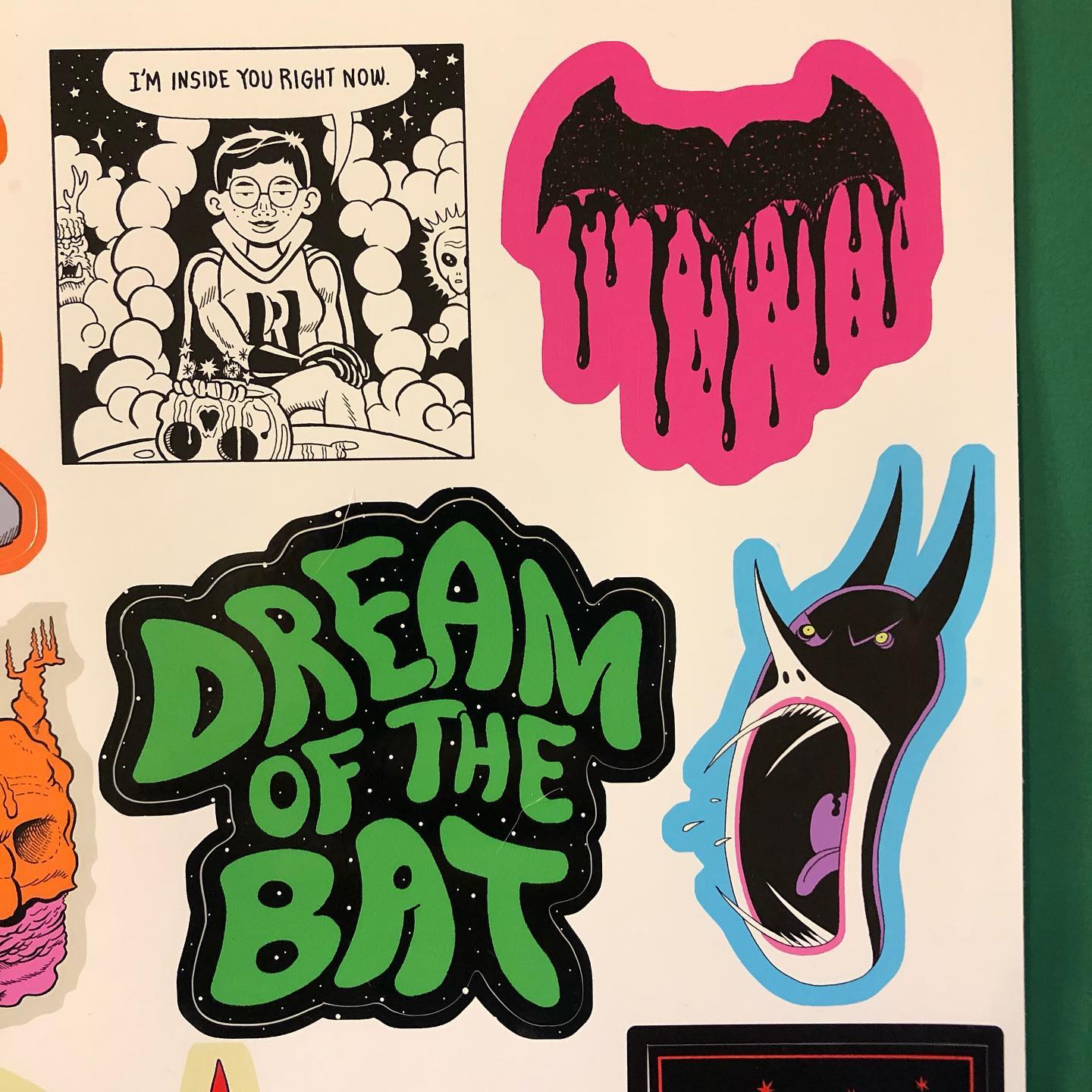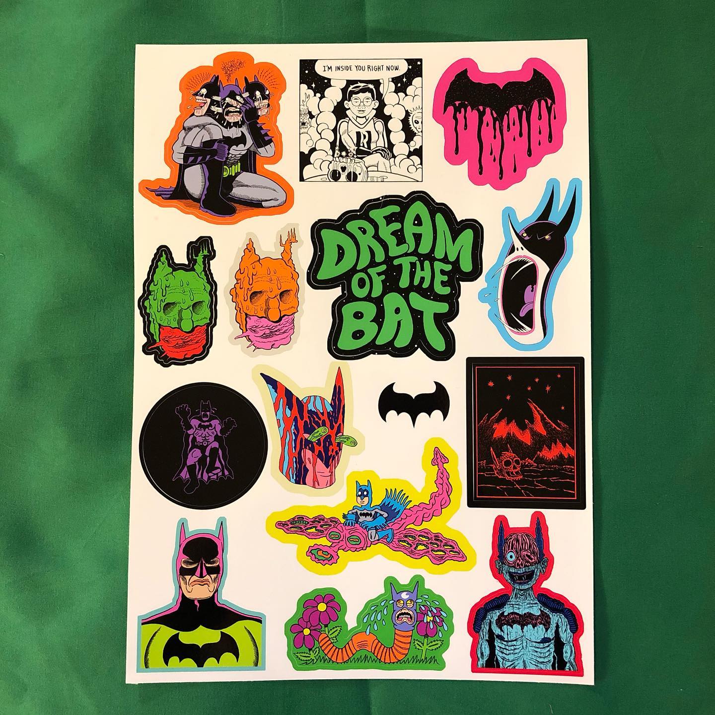11x14" for the sheet, most stickers are about 3" Art by Josh Simmons & Patrick Keck