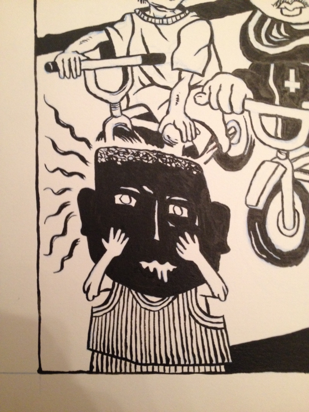 One panel gag comic, originally appeared in The Rat Nest #1. It stars Ben & Austin. India Ink on Bristol, Blue-Line pencil visible, 9X12.